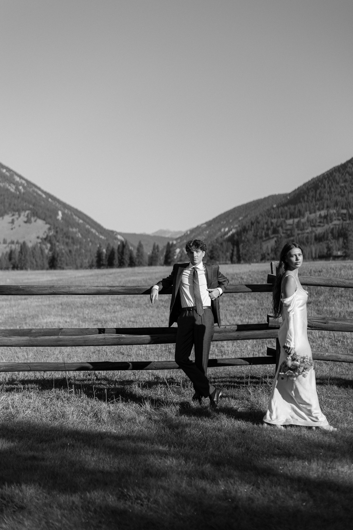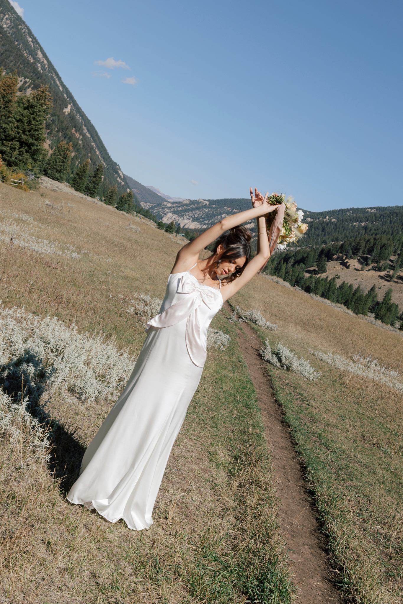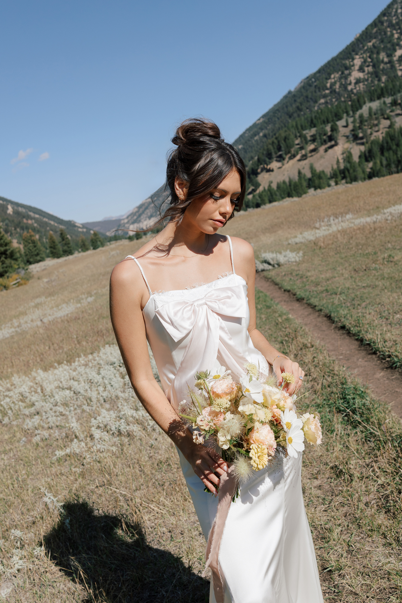A Love and Lemons gown with a delicate pink bow added a whimsical touch to the bridal outfit, pairing effortlessly with minimalistic, modern styling. Meanwhile, the soft, effortless hair styling complemented the serene beauty of the ranch and surrounding mountains. The gown’s playful charm balanced the rugged western backdrop, creating a romantic and refined visual story. Each detail — from the bow to the flowing lines of the dress — contributed to the poetic, western-inspired atmosphere.