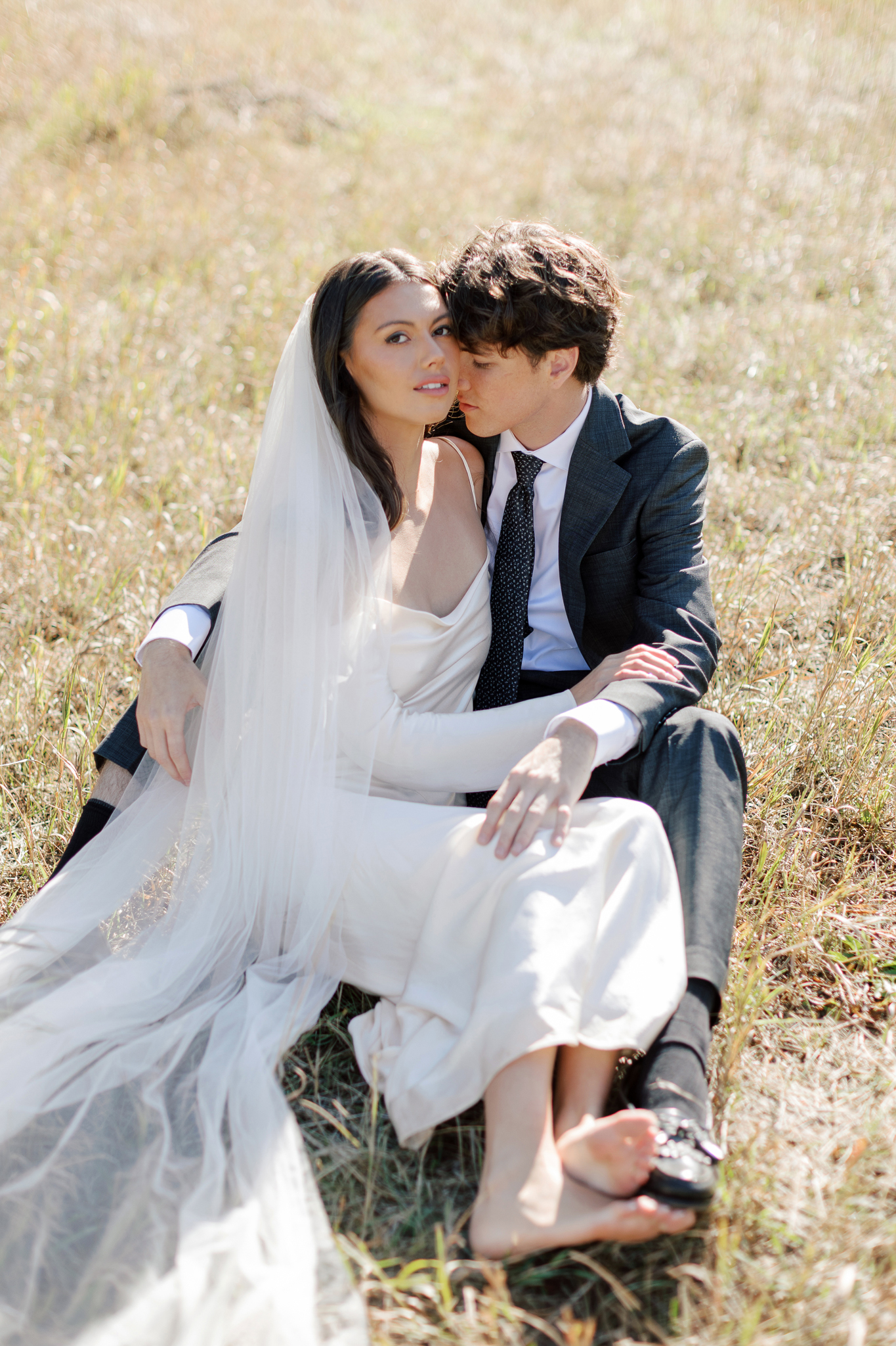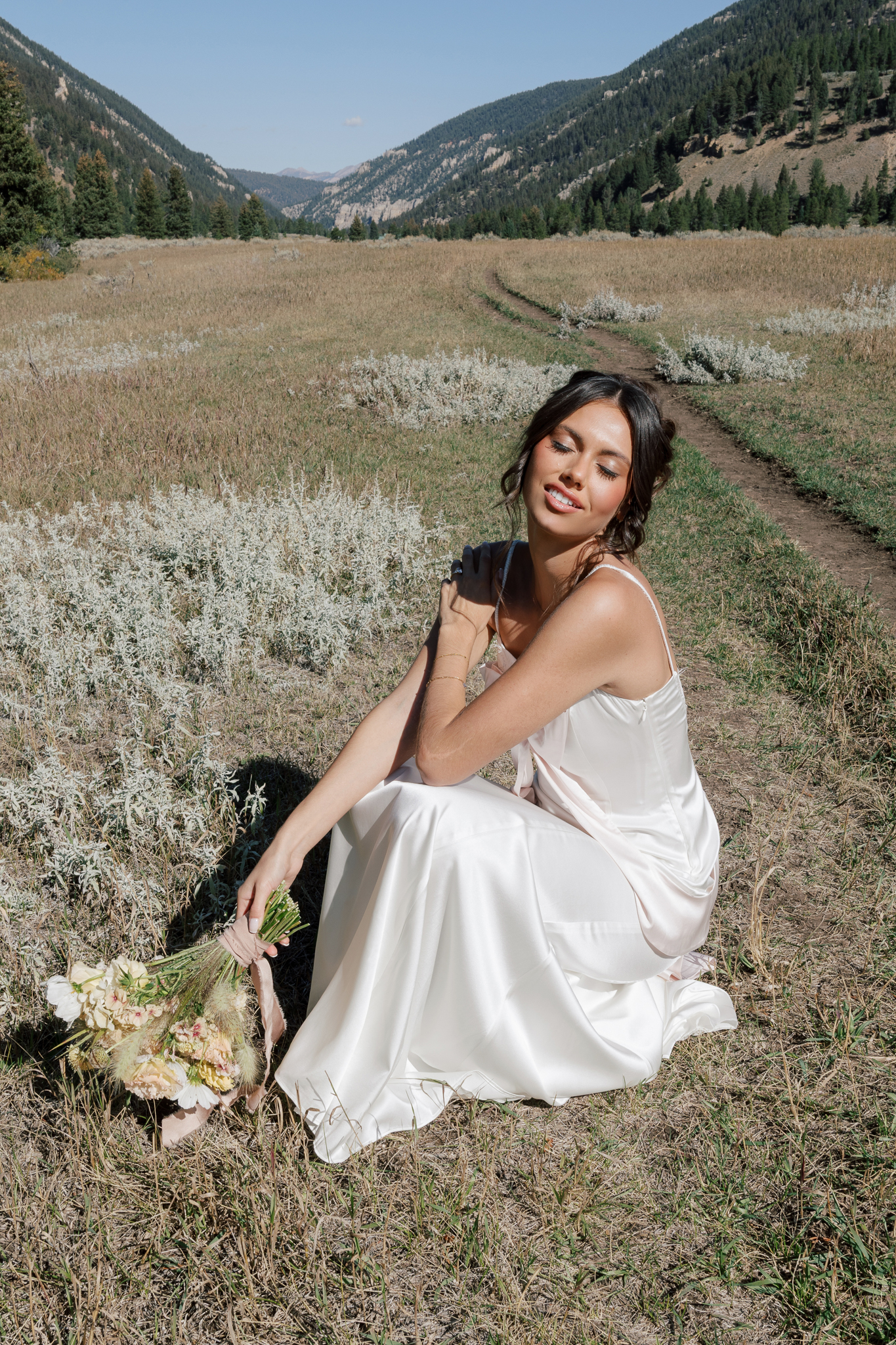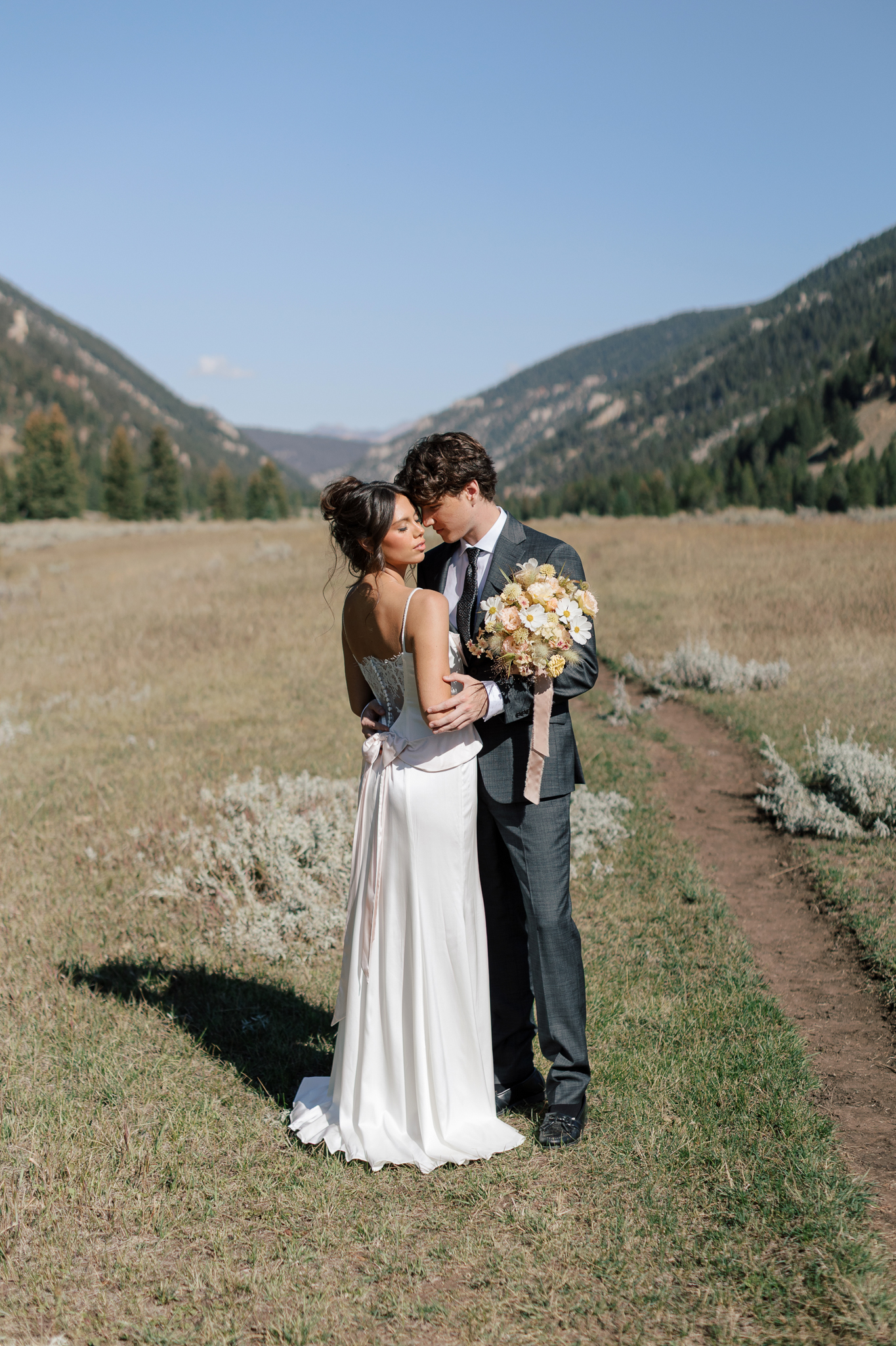A Love and Lemons gown with a delicate pink bow added a whimsical touch to the bridal outfit, pairing effortlessly with minimalistic, modern styling. Meanwhile, the soft, effortless hair styling complemented the serene beauty of the ranch and surrounding mountains. The gown’s playful charm balanced the rugged western backdrop, creating a romantic and refined visual story. Each detail — from the bow to the flowing lines of the dress — contributed to the poetic, western-inspired atmosphere.