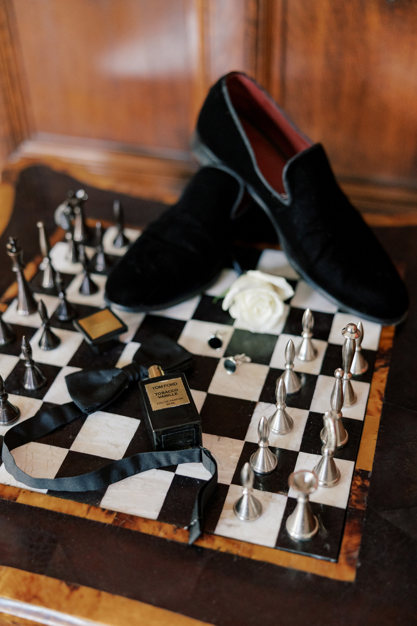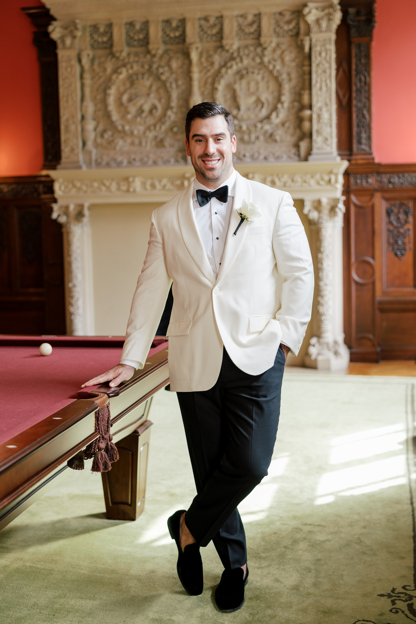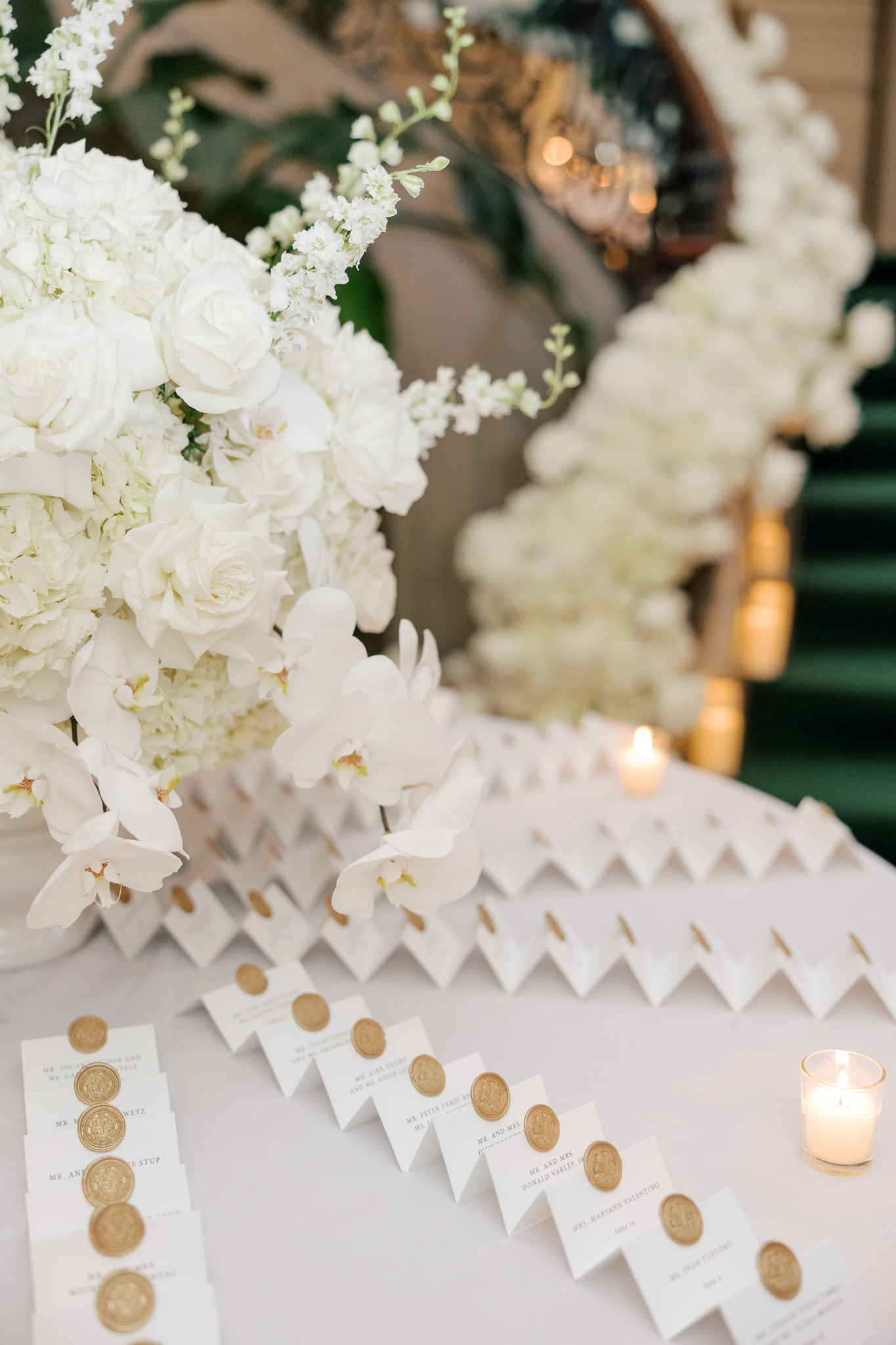 Nestled just outside Philadelphia, Elkins Estate offers a setting unlike any other. Meanwhile, the mansion’s ornate architecture, manicured gardens, and sweeping lawns create the ideal backdrop for couples who dream of an event that feels both sophisticated and intimate. Alongside the venue’s elegance, the golden accents and intricate detailing provided a perfect canvas for a design defined by grace and grandeur. In fact, every corner of the estate invited guests to explore and take in the beauty of the surroundings, adding to the overall sense of wonder.